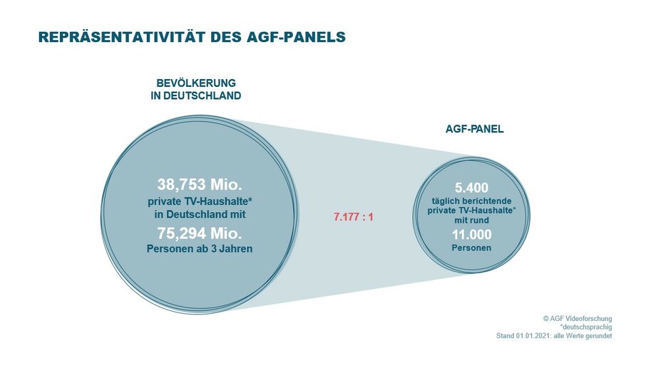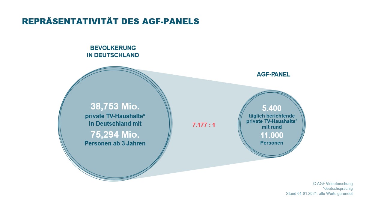 Mit dieser Grundgesamtheit wird die TV-Nutzung von rund 38,753 Millionen Fernsehhaushalten abgebildet, in denen an die 75,294 Millionen Personen ab 3 Jahre leben (Stand 04.01.2021).