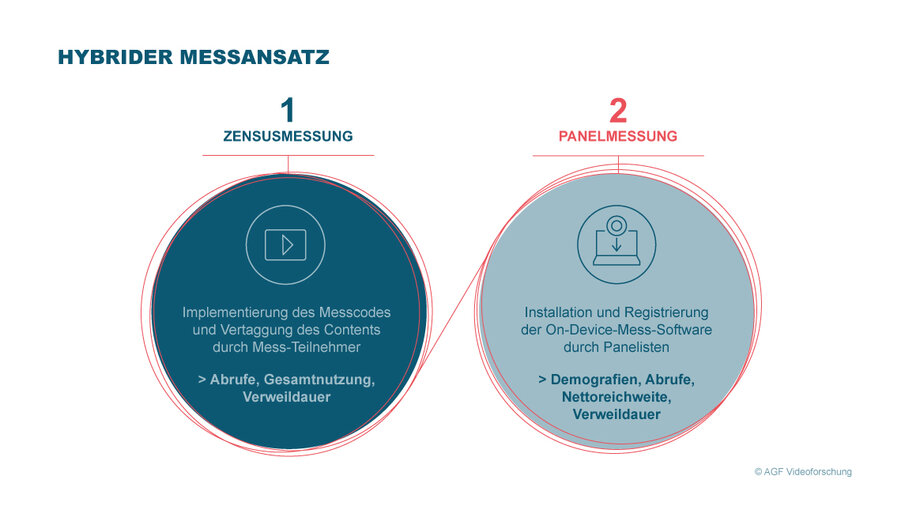 Um die Bewegtbildnutzung auf Desktop-PCs und Laptops zu messen, hat die AGF Videoforschung gemeinsam mit Nielsen einen hybriden Messansatz aus Panelmessung und Vollerhebung entwickelt. Er besteht aus zwei Säulen: Panels und Zensusmessung.