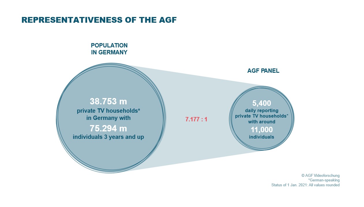 Since the beginning of 2016 the universe represented by the AGF system has been “the resident population of the Federal Republic of Germany in private households with at least one TV set in use and a German-speaking Main Income Earner.”