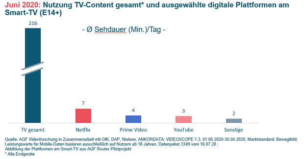 Im ersten, nun vorliegenden Report für den Monat Juni 2020 kommt Netflix bei den ab 14- Jährigen am Smart-TV auf eine durchschnittliche tägliche Sehdauer von 7 Minuten.