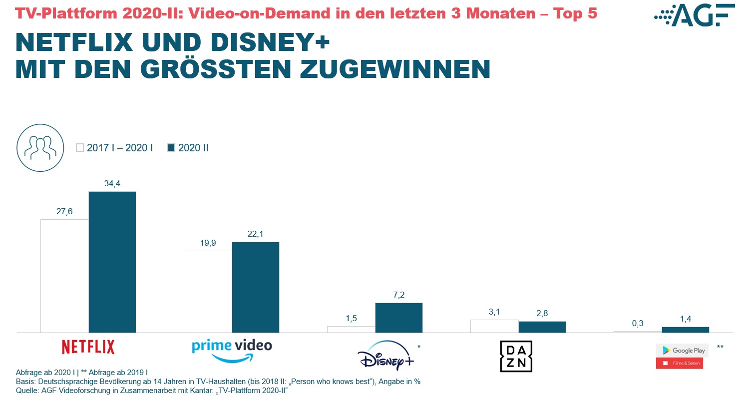 Von der steigenden Internetnutzung scheint unter anderem Disney+ profitiert zu haben. Der Marktstart in Deutschland fiel mit dem ersten coronabedingten Lockdown zusammen. Befragt danach, welche kostenpflichtigen Streaming-Dienste in den letzten drei Monaten genutzt wurden, nannten in der Welle 2020-I noch 1,5 Prozent der Befragten Disney+. Aktuell sind es bereits 7,2 Prozent. Damit liegt Disney+ auf Rang 3 hinter Netflix mit 34,4 Prozent und Amazon Prime Video mit 22,1 Prozent sowie vor Dazn mit 2,8 Prozent. Netflix konnte kräftig wachsen und verzeichnet einen Anstieg von fast 7 Prozentpunkten. Das entspricht einem Plus von 24,6 Prozent.
